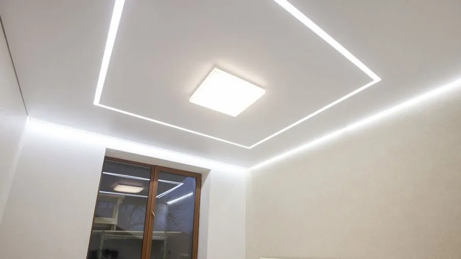 Парящие натяжные потолки дают расслабляющий свет, трековые светильники подсветят нужные зоны и оставят в приятной полутьме те места, которые подсветки не требуют.